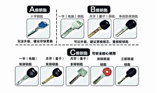 B级锁:B级锁钥匙为平板钥匙,有双排弹子槽,跟A级锁不同的地方在于钥匙面多了一排弯弯曲曲不规则的线条。锁芯主要类型为3种,电脑双排锁芯、双排月牙锁芯、双面叶片锁芯。防技术性开启时间5分钟内,互开率高。通过强扭工具,1分钟内可以开启锁芯。